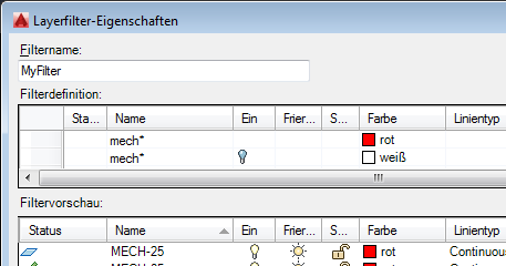 In diesem Beispiel enthält der Layereigenschaftenfilter die Layer, die mit "mech" beginnen und rot sind, oder Layer, die mit "mech" beginnen und deaktiviert und weiß sind.
