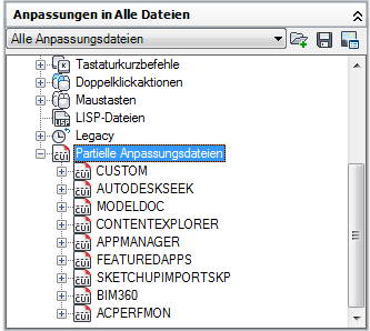 Der Bereich Anpassungen in dient zur Navigation durch die verschiedenen Benutzeroberflächenelemente, die in den geladenen Anpassungsdateien enthalten sind.