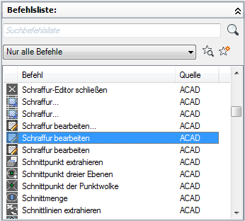Oben im Bereich Befehlsliste befindet sich das Feld Suchbefehlsliste, mit dem Sie die Befehlsliste basierend auf einer eingegebenen Textzeichenfolge filtern können. Die Textzeichenfolge wird mit allen Teilen eines Befehlsnamens abgeglichen, woraufhin im Feld Befehlsliste die Ergebnisse angezeigt werden.