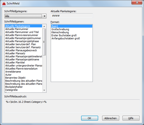 Zeigt den Ausdruck an, der dem Schriftfeld zugrunde liegt. Der Schriftfeldausdruck kann zwar nicht bearbeitet werden, dieser Bereich gibt jedoch Aufschluss darüber, wie Schriftfelder aufgebaut sind.
