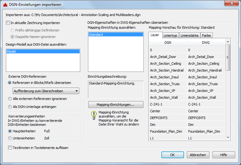 Standard ist die vorgabemäßige Mapping-Einrichtung, die Daten aus der exportierten Zeichnung extrahiert und ein automatisches Mapping für DGN-Layer, Linientypen, Linienstärken und Farben, wie in der Mapping-Voransicht angezeigt, verwendet.