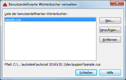 Zeigt die Liste der benutzerdefinierten Wörterbücher an. Es kann nur jeweils ein Wörterbuch ausgewählt werden.
