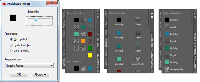- Ansichtsoptionen. Ändert den Anzeigestil und die Größe der Symbole in einer Werkzeugpalette.