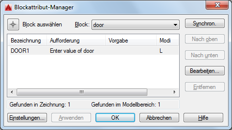 Hier können Sie Attributdefinitionen bearbeiten, Attribute aus Blöcken entfernen und die Reihenfolge ändern, in der Sie beim Einfügen eines Blocks die Attributwerte eingeben.