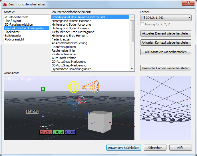Der Kontext bezieht sich auf die Betriebsumgebung wie z. B. den Modellbereich. Ein Benutzeroberflächenelement ist ein Element, das in diesem Kontext sichtbar ist, z. B. der Fadenkreuz-Zeiger oder die Hintergrundfarbe.