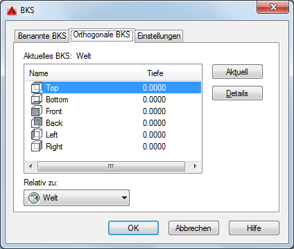 Zeigt eine Liste der sechs orthogonalen Koordinatensysteme in der aktuellen Zeichnung an. Die orthogonalen Koordinatensysteme werden relativ zu dem BKS festgelegt, das in der Liste Relativ zu angegeben wurde.