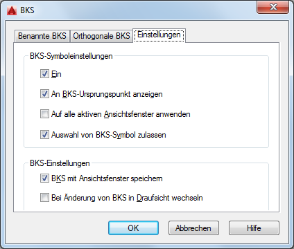 Zeigt eine Liste der Benutzerkoordinatensystem-Definitionen (BKS) an, benennt diese um, stellt sie wieder her und steuert BKS- sowie BKS-Symboleinstellungen für Ansichtsfenster.