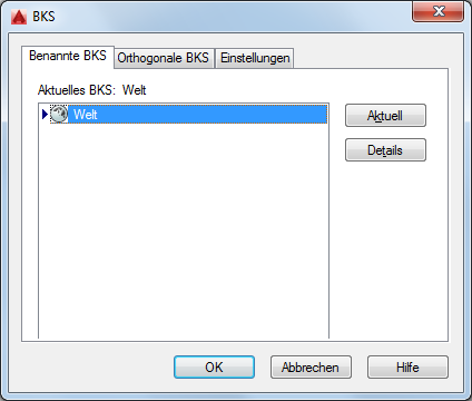 Zeigt eine Liste der in der aktuellen Zeichnung definierten BKS an. Das aktuelle BKS wird markiert.