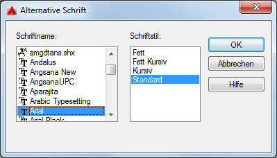Wenn Sie keine alternative Schrift bestimmen, wird beim Öffnen von Zeichnungen, die nicht aufgefundene Schriften enthalten, ein Dialogfeld angezeigt, in dem Sie jeweils eine Schrift als Ersatz für die fehlenden Schriften festlegen können.