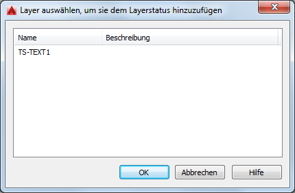 Zeigt den Namen und die Beschreibung der Layer an, die dem Layerstatus nicht hinzugefügt wurden. Wählen Sie den hinzuzufügenden Layer, und klicken Sie auf OK.