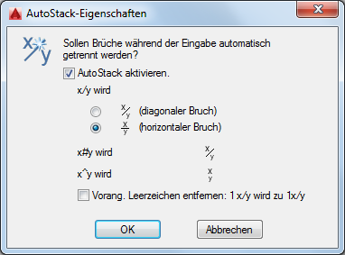 Anmerkung: Unabhängig davon, ob AutoStack aktiviert ist oder nicht, wird die Raute stets in einen diagonalen Bruch umgewandelt und der Zirkumflex stets in einen Toleranzwert.