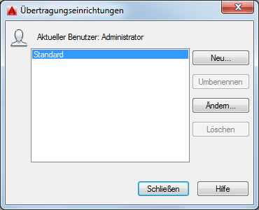 Öffnet im Kontext eines Plansatzes ein Standarddialogfeld zur Dateiauswahl, in dem Sie zu einer DST-Datendatei (Plansatz) navigieren können. Daraufhin wird das Dialogfeld Übertragungseinrichtungen importieren angezeigt, in dem Sie die zu importierenden Übertragungseinrichtungen festlegen können.
