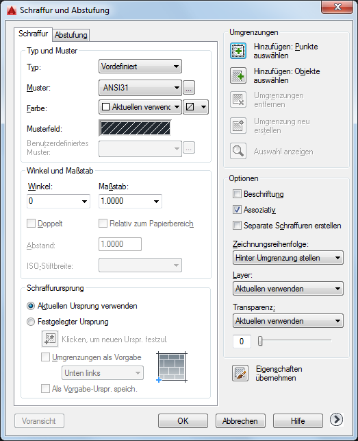 Das Dialogfeld Schraffur und Abstufung hat zwei Registerkarten. Einige Optionen sind auf beiden Registerkarten verfügbar.