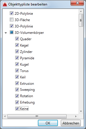 - Klicken Sie im Dialogfeld Objekttypliste auf den Objekttyp, für den Eigenschaften in der Schnelleigenschaftenpalette angezeigt werden sollen.