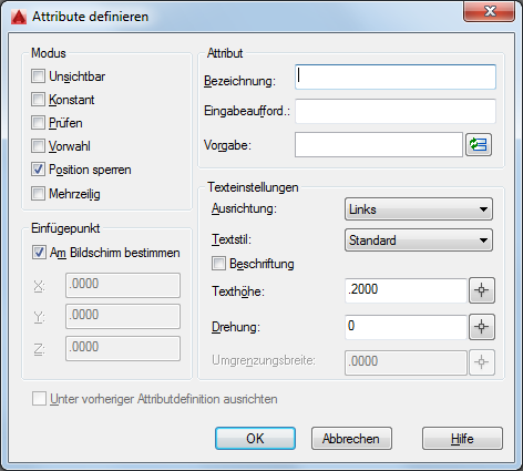 Die Vorgabewerte werden in der Systemvariable AFLAGS gespeichert. Eine Änderung der Einstellungen für AFLAGS wirkt sich auf den Vorgabemodus für neue Attributdefinitionen aus und nicht auf vorhandene Attributdefinitionen.