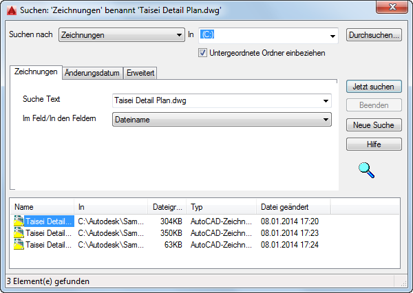 Legt die Art der zu suchenden Inhalte fest. Der angegebene Inhaltstyp bestimmt, welche Registerkarten im Dialogfeld Suchen angezeigt werden und welche Felder auf diesen verfügbar sind. Die Registerkarten Änderungsdatum und Erweitert werden nur dann angezeigt, wenn im Feld Suchen nach die Option Zeichnungen ausgewählt ist.