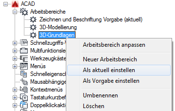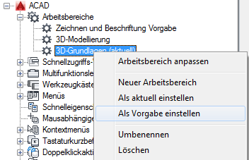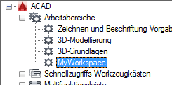 Arbeitsbereiche in einer CUIx-Datei können als Vorgabe markiert werden. Durch die Festlegung eines Arbeitsbereichs als Vorgabe wird bestimmt, dass dieser Arbeitsbereich wiederhergestellt werden soll, wenn die CUIx-Datei erstmals in das Programm geladen wird bzw. nachdem die CUIx-Datei mit dem Befehl ABILAD geladen wurde.