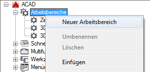 Anmerkung: In AutoCAD können im Netzwerkeinrichtungsassistenten die Haupt- und Unternehmens-CUIx-Dateien angegeben werden. Wenn für die Haupt-CUIx-Datei ein Vorgabe-Arbeitsbereich festgelegt wurde, wird dieser als aktueller Arbeitsbereich eingestellt, wenn die Datei zum ersten Mal geladen wird.
