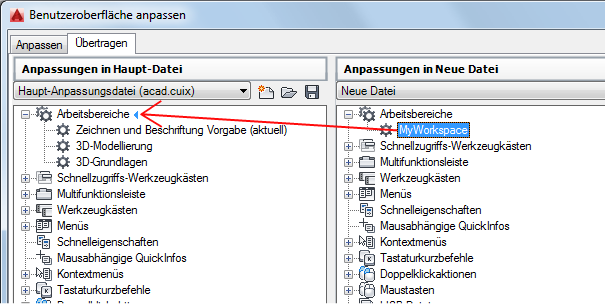 4. Ziehen Sie im Bereich Anpassungen in <Dateiname> (rechte Seite) den Arbeitsbereich aus der CUIx-Datei auf den Knoten Arbeitsbereiche der Haupt-CUIx-Datei im Bereich Anpassungen in <Dateiname> (linke Seite).