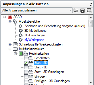 2. Klicken Sie auf der Registerkarte Anpassen im Bereich Anpassungen in <Dateiname> auf das Pluszeichen (+) neben dem Knoten Arbeitsbereiche, um ihn zu erweitern.