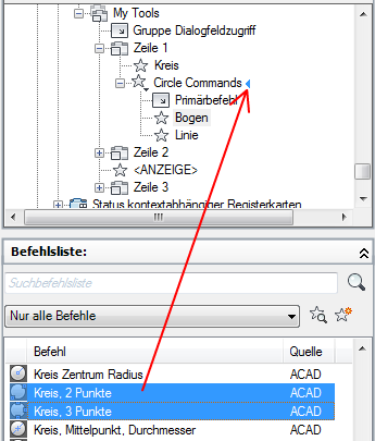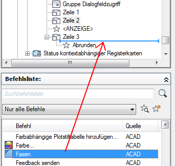 - Ziehen Sie einen Befehl aus der Befehlsliste in eine Zeile, eine untergeordnete Gruppe oder ein Dropdown-Menü der Gruppe.