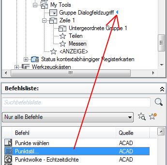 - Ziehen Sie einen Befehl aus der Befehlsliste auf die Option Gruppe Dialogfeldzugriff in der Gruppe.