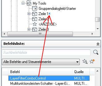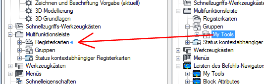 - Ziehen Sie die neue Multifunktionsleisten-Gruppe aus dem Bereich Anpassungen in <Dateiname> rechts vom Knoten Gruppen einer geladenen CUIx-Datei in den Bereich Anpassungen in <Dateiname> auf der linken Seite.