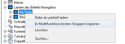 - Klicken Sie mit der rechten Maustaste auf den Befehls-Navigator, den Sie kopieren und in eine Multifunktionsleisten-Gruppe konvertieren möchten. Klicken Sie auf In Multifunktionsleisten-Gruppen kopieren.