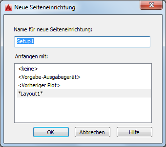 Legt einen Namen für die neue Seiteneinrichtung fest und gibt an, welche Seiteneinrichtung als Ausgangspunkt verwendet werden soll.