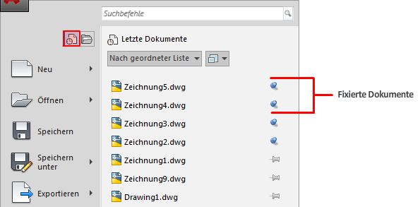 Dateien werden in der Liste Letzte Dokumente angezeigt, wobei die zuletzt geöffnete Datei vorgabemäßig ganz oben steht.