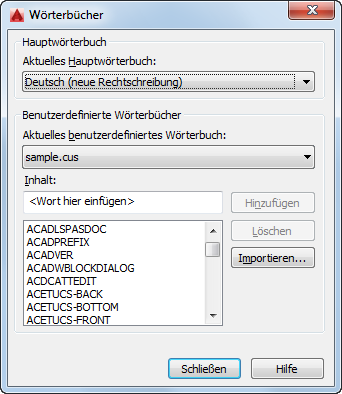 Zeigt den Namen des aktuellen Benutzerwörterbuchs an. Die Erweiterungcus wird für AutoCAD-Benutzerwörterbücher verwendet.