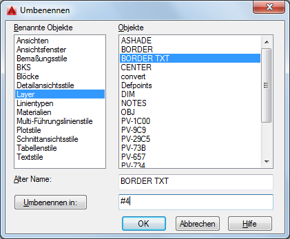 Ändert die Namen, die benannten Objekten wie Layern und Bemaßungsstilen zugewiesen wurden.