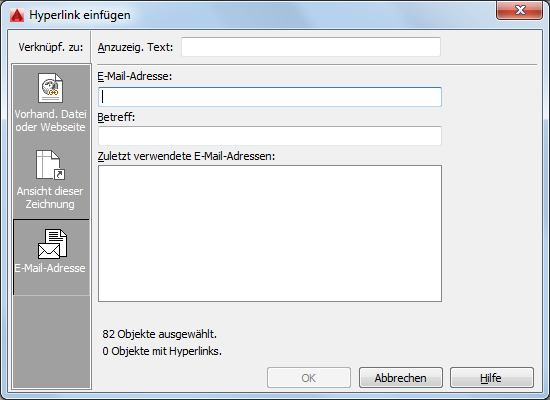 Listet die zuletzt verwendeten E-Mail-Adressen auf, aus denen Sie eine für die Erstellung eines Hyperlinks auswählen können.