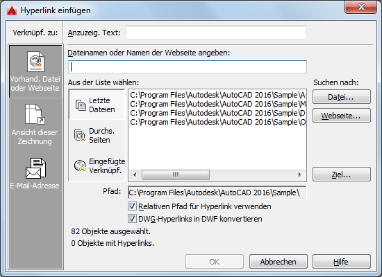 Zeigt den Pfad zur Datei an, die mit dem Hyperlink verknüpft ist. Wenn die Option Relativen Pfad für Hyperlink verwenden aktiviert ist, wird hier lediglich der Dateiname aufgeführt. Wenn die Option Relativen Pfad für Hyperlink verwenden deaktiviert ist, wird der vollständige Pfad und der Dateiname angegeben.