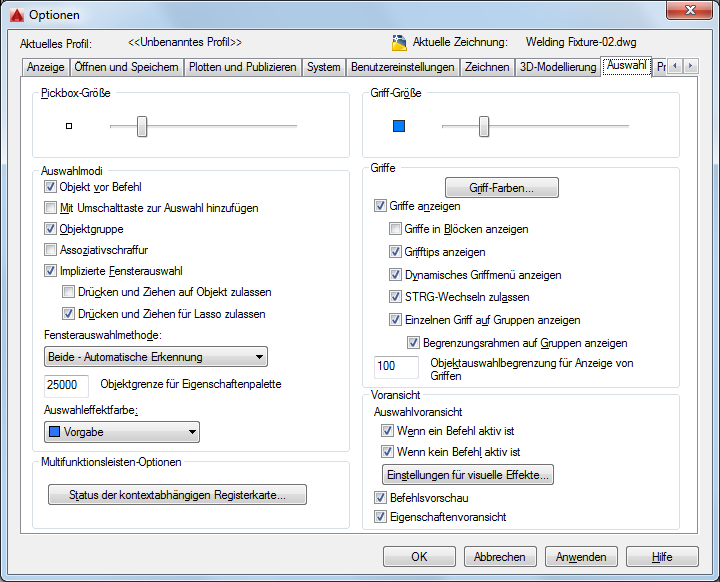 Steuert, ob Objekte vor oder nach der Eingabe eines Befehls ausgewählt werden sollen. (Systemvariable PICKFIRST)