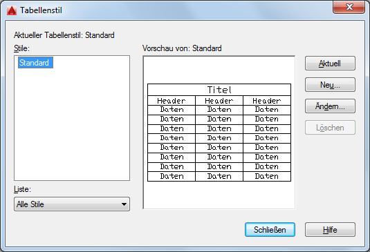 Löscht die in der Liste Stile ausgewählten Tabellenstile. Ein Stil, der in der Zeichnung verwendet wird, kann nicht gelöscht werden.