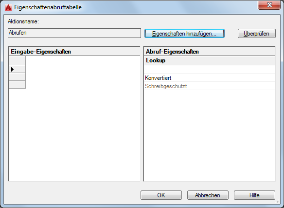 Zeigt den benutzerdefinierten Wert an, der den Eingabeeigenschaften zugewiesen ist. Klicken Sie unten in eine Abrufspalte, um die Abrufeigenschaft mit Schreibschutz zu versehen oder um den umgekehrten Abruf zu ermöglichen. Umgekehrten Abruf ermöglichen aktiviert eine mit dem Abrufgriff verknüpfte Dropdown-Liste, welche die Blockreferenz so ändert, dass sie den Eingabewerten in der Tabelle entspricht.