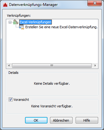 Zeigt Verknüpfungen in der Zeichnung an. Bietet auch Optionen zum Erstellen von neuen Datenverknüpfungen an.