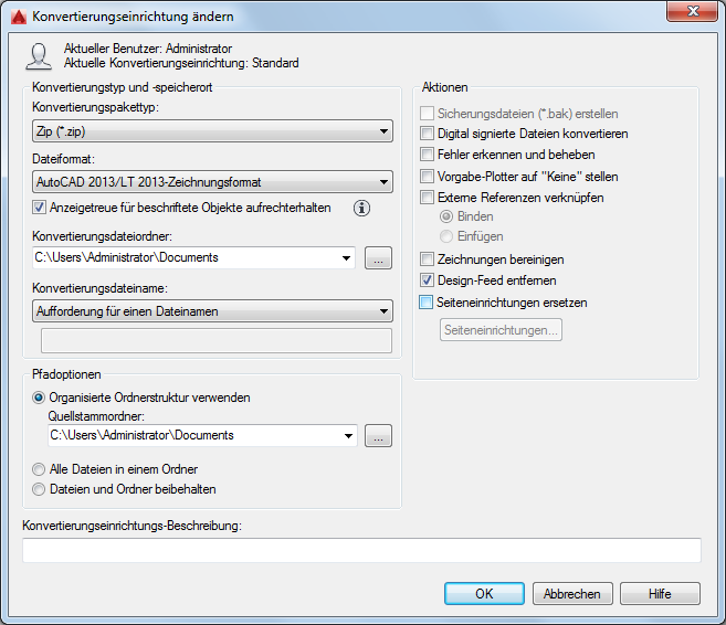 Wenn Sie dieses Feld nicht ausfüllen, wird die Konvertierungsdatei in dem Ordner erstellt, der die zuerst festgelegte Zeichnungsdatei enthält. In einem Plansatzkontext wird die Konvertierungsdatei in dem Ordner angelegt, der die Plansatzdatendatei (DST) enthält.