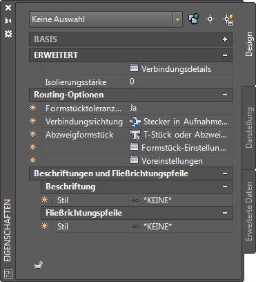 Eigenschaften auf der Registerkarte Design der Eigenschaftenpalette, die zum Hinzufügen von Rohrobjekten verwendet werden