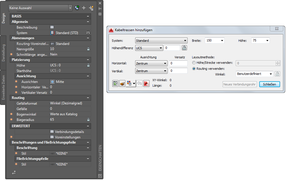 Die Kabeltrassen- und Installationsrohr-Werkzeuge haben spezifische vordefinierte Systeme wie 120-V-Strom oder Daten. Die Kabeltrassen oder Installationsrohre, die Sie zeichnen, erben die Eigenschaften des Systems wie die Parameter, die Darstellungseigenschaften und den Anstieg/Abfall-Stil.