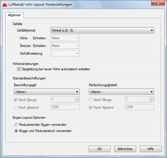 Im Dialogfeld Luftkanal/-rohr-Layout-Voreinstellungen werden auf der Registerkarte Allgemein die Luftkanal/-rohr-Layout-Voreinstellungen für Gefälle, Höhe, Beschriftungen, Fließrichtungspfeile und Bogen gesteuert.