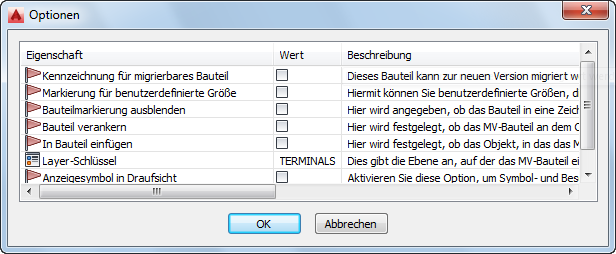 Dialogfeld Optionen eines parametrischen MV-Bauteils
