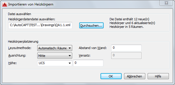 Achtung: Für jeden Raum in der Datei, der einem Raum in der Zeichnung entspricht, wird die zugehörige Heizkörperliste je nach ausgewählter Layoutmethode von der Software verarbeitet.