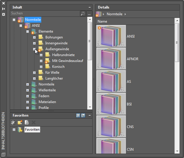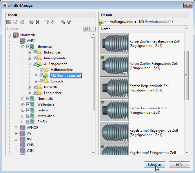 Durch eine Aktualisierung kann sich das Aussehen bereits in der Inhaltsbibliothek enthaltener Normteile oder Elemente ändern. Dies ist jedoch in der Regel nur der Fall, wenn die Inhaltsaktualisierung zur Korrektur eines Fehlers herausgegeben wurde. Falls Sie das fehlerhafte Normteil bzw. Element bereits in eine Zeichnungsdatei eingefügt haben, können Sie es aktualisieren, indem Sie im Zeichnungsbereich darauf doppelklicken.
