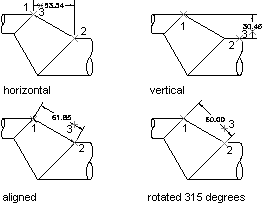 You create linear dimensions by creating instances of the AlignedDimension and RotatedDimension objects. After you create an instance of a linear dimensions, you can modify the text, the angle of the text, or the angle of the dimension line. The following illustrations show how the type of linear dimension and the placement of the extension line origins affect the angle of the dimension line and text.