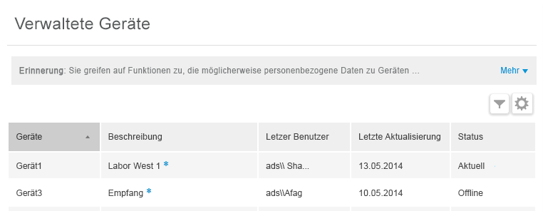Gerätenamen (die den NT-Computernamen widerspiegeln) können kryptisch sein und möglicherweise nur schwer dem eigentlichen Gerät oder Benutzer zugeordnet werden. Als Administrator können Sie die Gerätenamen, Gerätebeschreibungen und Benutzernamen so bearbeiten, dass sie aussagekräftiger sind (Aliasnamen) und beim Filtern der Geräte in einer nützlichen Reihenfolge angezeigt werden. Sie können zum Beispiel die Design-Computer von den Vertriebs-Computern unterscheiden, indem Sie dem Gerätenamen eine entsprechende Textzeichenfolge hinzufügen, z. B. "KONSTR" und "VERTRIEB". Wenn Sie über Geräte an verschiedenen Standorten verfügen, können Sie den Namen des Standorts in die Gerätebeschreibung einbeziehen, um die Geräte nach Standort zu klassifizieren.