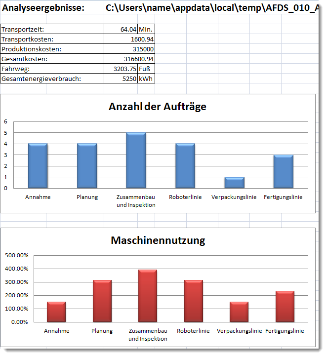 Bei kontinuierlichen Transporttypen: Wenn (Einrichtungszeit + Verarbeitungszeit) * Stapelgröße < (Länge der Verbindungslinie / Fahrgeschwindigkeit) Summe (Einrichtungszeit + Verarbeitungszeit) * Stapelgröße für alle Aufträge Ansonsten: Summe der (Länge der Verbindungslinie / Fahrgeschwindigkeit + Ladezeit + Entladezeit) * (aufgerundet(Bauteil-Menge des Auftrags / Stapelgröße)) für alle Aufträge Bei nicht kontinuierlichen Transporttypen: Summe der (Länge der Verbindungslinie / Fahrgeschwindigkeit + Ladezeit + Entladezeit) * (aufgerundet(Bauteil-Menge des Auftrags / Stapelgröße)) für alle Aufträge |