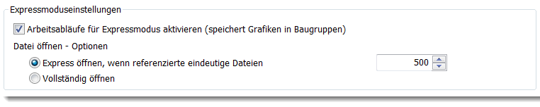 Ist diese Option aktiviert, wird der Express-Modus automatisch aufgerufen, wenn eine Datei die Größeneinstellung überschreitet. Vollständig öffnen deaktiviert den Express-Modus und lädt alle Komponentendaten bei jedem Öffnen eines Layouts.