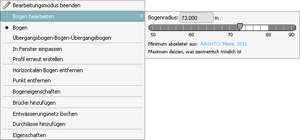 Sie können den Radius aus einem Bereich von Werten auswählen oder die Bogenpunkte der Tangente oder die Mittelpunkt-Manipulatoren ziehen.